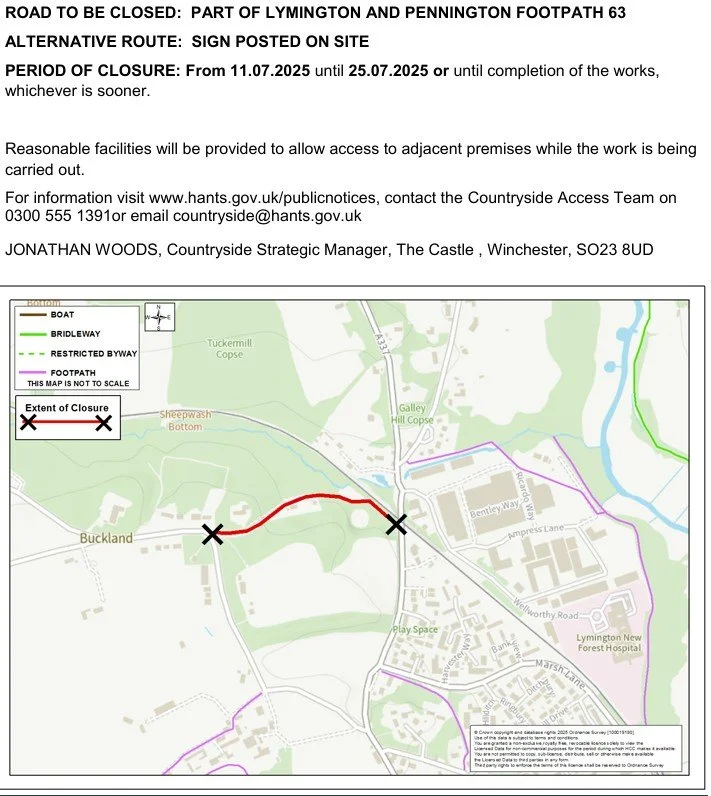 July 11, 2025 Temporary Closure - Part of Lymington & Pennington Footpath 63 July 11, 2025/ Jo Stroud